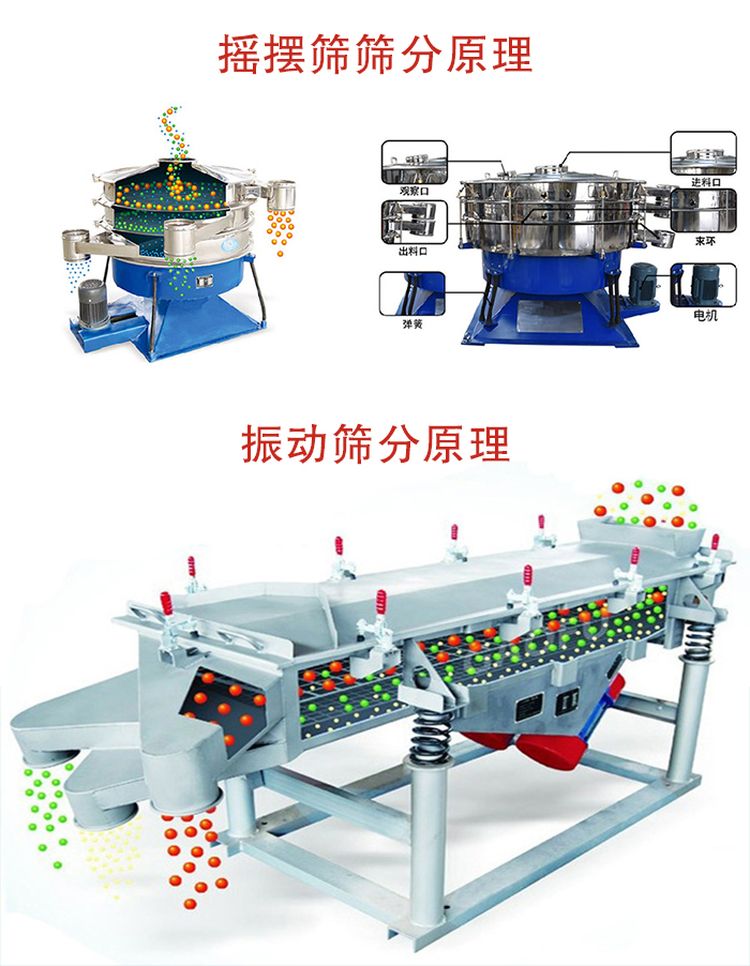 搖擺篩是模仿人工篩分,物料在篩面做非線性的三維運動,既有圓周運動,又有上拋弧運動,而振動篩是采用雙電機或直立式電機驅(qū)動,物料運動軌跡是一臺直線或者水平、傾斜、垂直的三次元運動。