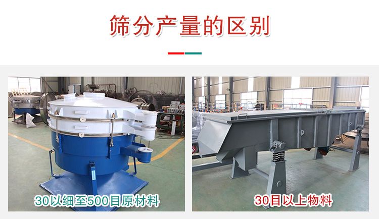 針對30目以粗上物料而言,振動篩和搖擺篩產(chǎn)量基本相同,對30以細至500目原材料來說,搖擺篩的生產(chǎn)量則大大高過振動篩,一般為振動篩的5—10倍。