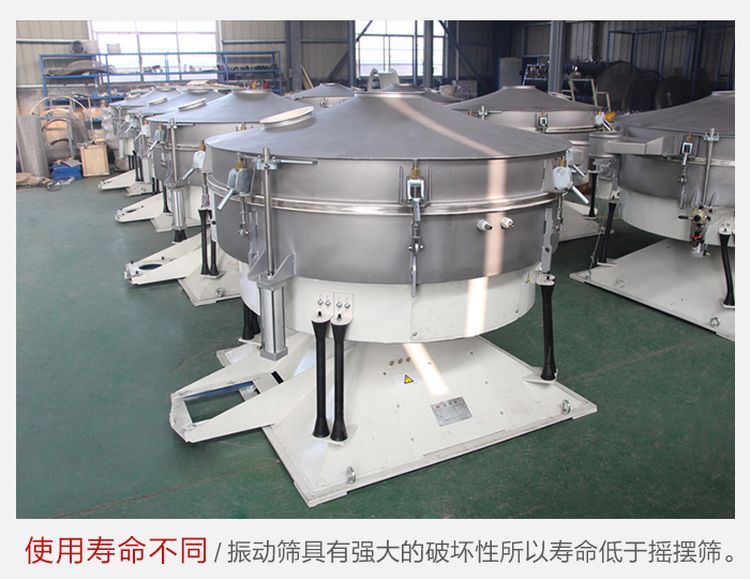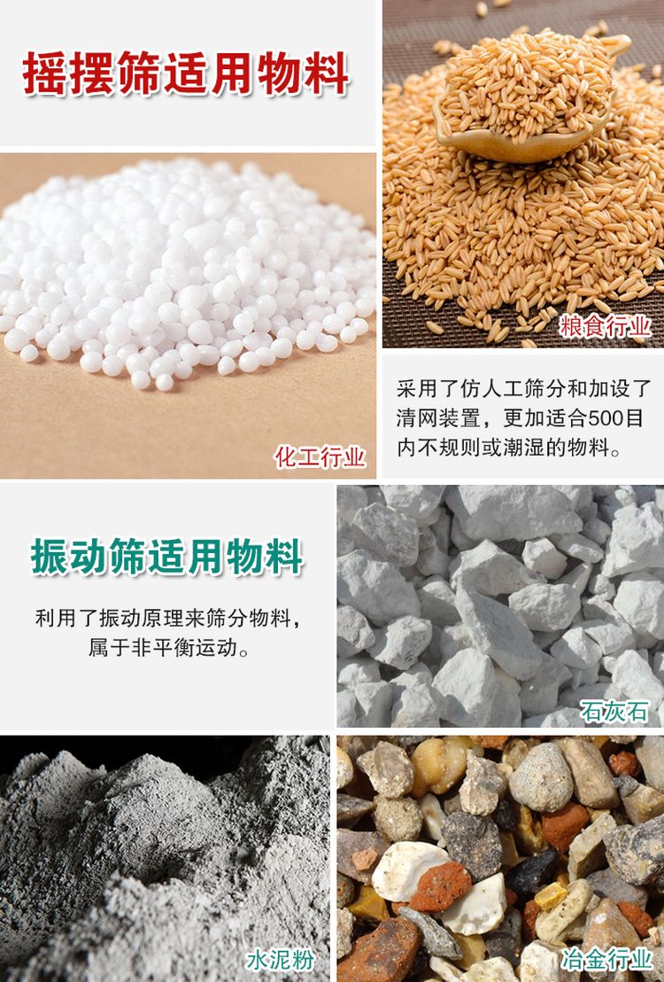 搖擺篩由于采用了仿人工篩分和加設(shè)了清網(wǎng)裝置,所以更加適合500目內(nèi)不規(guī)則或潮濕的物料,克服了普通振動篩的堵網(wǎng)風險,而振動篩屬于非平衡破壞暴力運動,利用了振動原理來篩分物料,所以有時還會破壞物料,所以對于一些顆粒狀結(jié)晶焦脆物料,建議使用搖擺篩,其篩分精度可達95% 以上。
