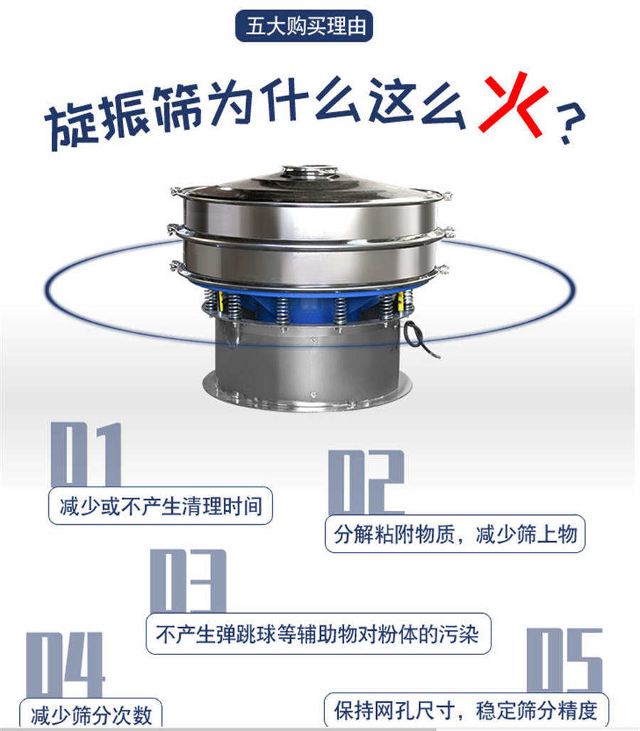 篩選范圍廣--只有系列三次元旋振篩能分選如此廣的原料范圍:任何顆粒、細粉、漿液都可以篩選。篩分細500目(28微米),過濾細5微米。網孔防堵塞--三次元振動功能及自動清理堵網裝置把堵網幾率降到小。 單層或多層分選--每臺旋振篩可選一至五層篩網,能同時進行二到六個等級的分選或過濾。