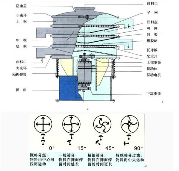 旋振篩是由直立式電機作激振源,電機上、下兩端安裝有偏心重錘,將電機的旋轉運動轉變?yōu)樗健⒋怪薄A斜的三次元運動,再把這個運動傳遞給篩面。通過調節(jié)上、下兩端的相位角,可以改變物料在篩面上的運動軌跡,通過增減振動電機上下兩端的偏心重錘配重塊重量可以增加和減少震動幅度。