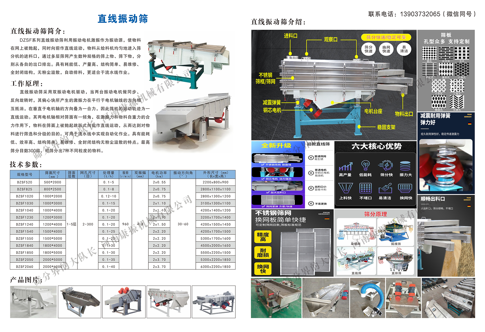 直線振動篩采用雙振動電機驅(qū)動,當兩臺振動電機做同步反向旋轉(zhuǎn)時,其偏心塊所產(chǎn)生的激振力在平行于電機軸線的方向相互抵消,在垂直于電機軸的方向疊為一合力,因此篩機的運動軌跡為-直線運動。其兩電機軸相對篩面有一傾角,在激振力和物料自重力的合力作用下,物料在篩面上被拋起跳躍式向前作直線運動,從而達到對物料進行篩選和分級的目的。可用于流水線中實現(xiàn)自動化作業(yè)。具有能耗低、效率高、結(jié)構簡單、易維修、全封閉結(jié)構無粉塵溢散的特點。最高篩分目數(shù)300目,可篩分出7種不同粒度的物料。