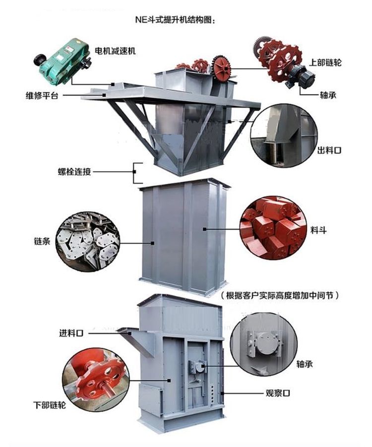 NE系列板鏈斗式提升機由運行部件、驅動裝置、上部裝置、中部機殼、下部裝置組成。